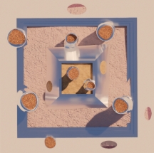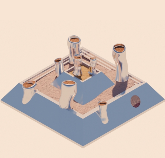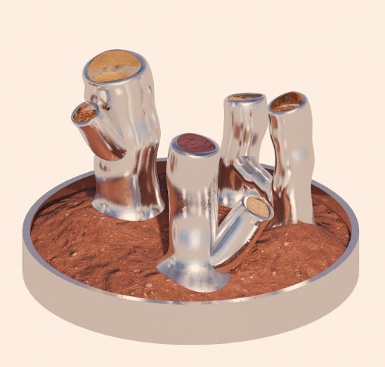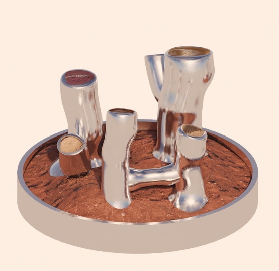 Plants do not exist by themselves, but are part of a soil food web comprising multiple interconnected organisms—and indeed, multiple kingdoms. We humans tend to believe the value lies in the plants, when in fact the center of life on land is the soil. This miniature garden speaks about the soil not as a surface, but as a four‑dimensional living system. The plants, their roots, and the organisms in the soil form a single unit. This living soil system is expressed through the shape of the garden’s container-object, as well as through visible areas of soil that reveal these processes.