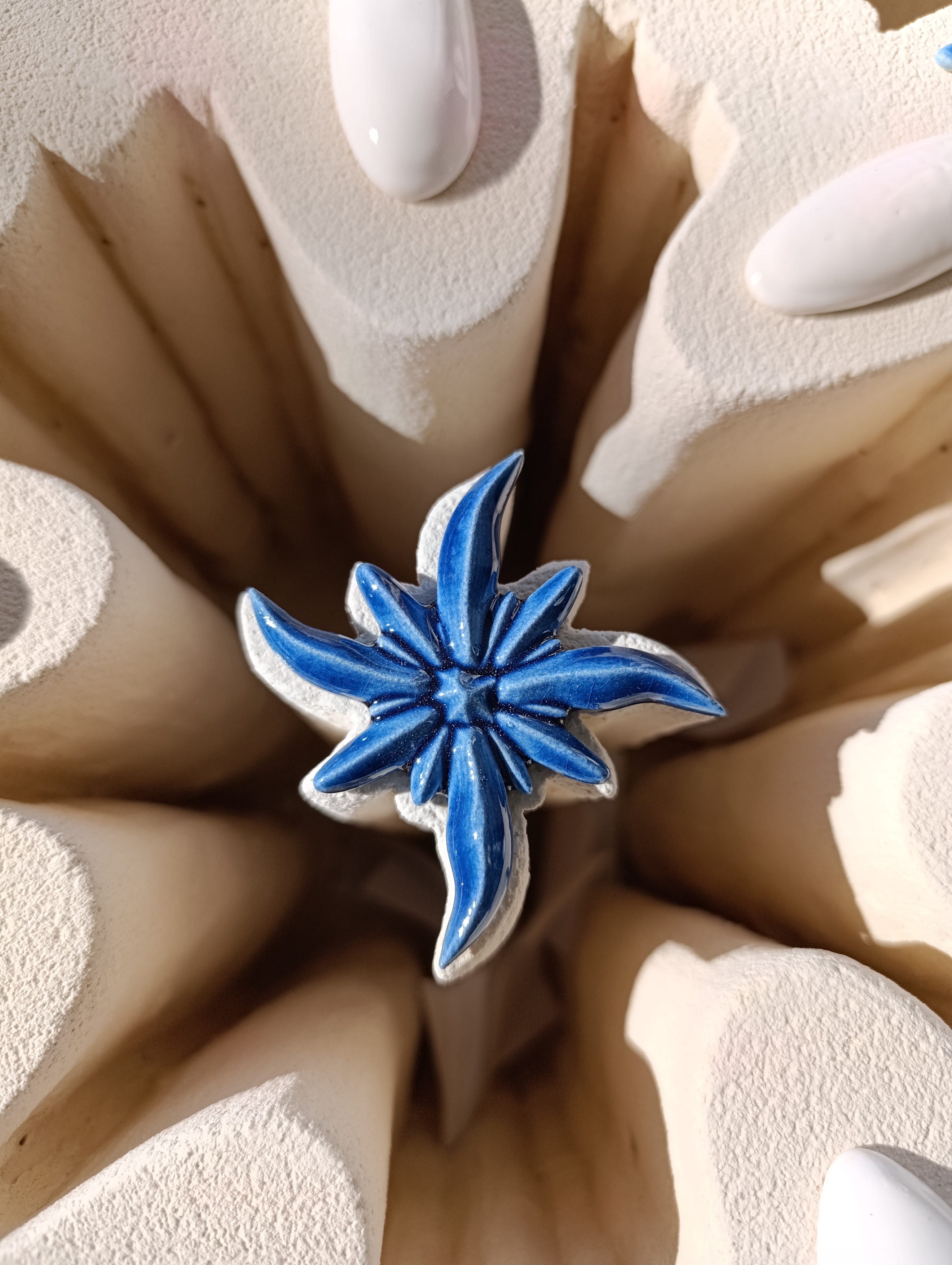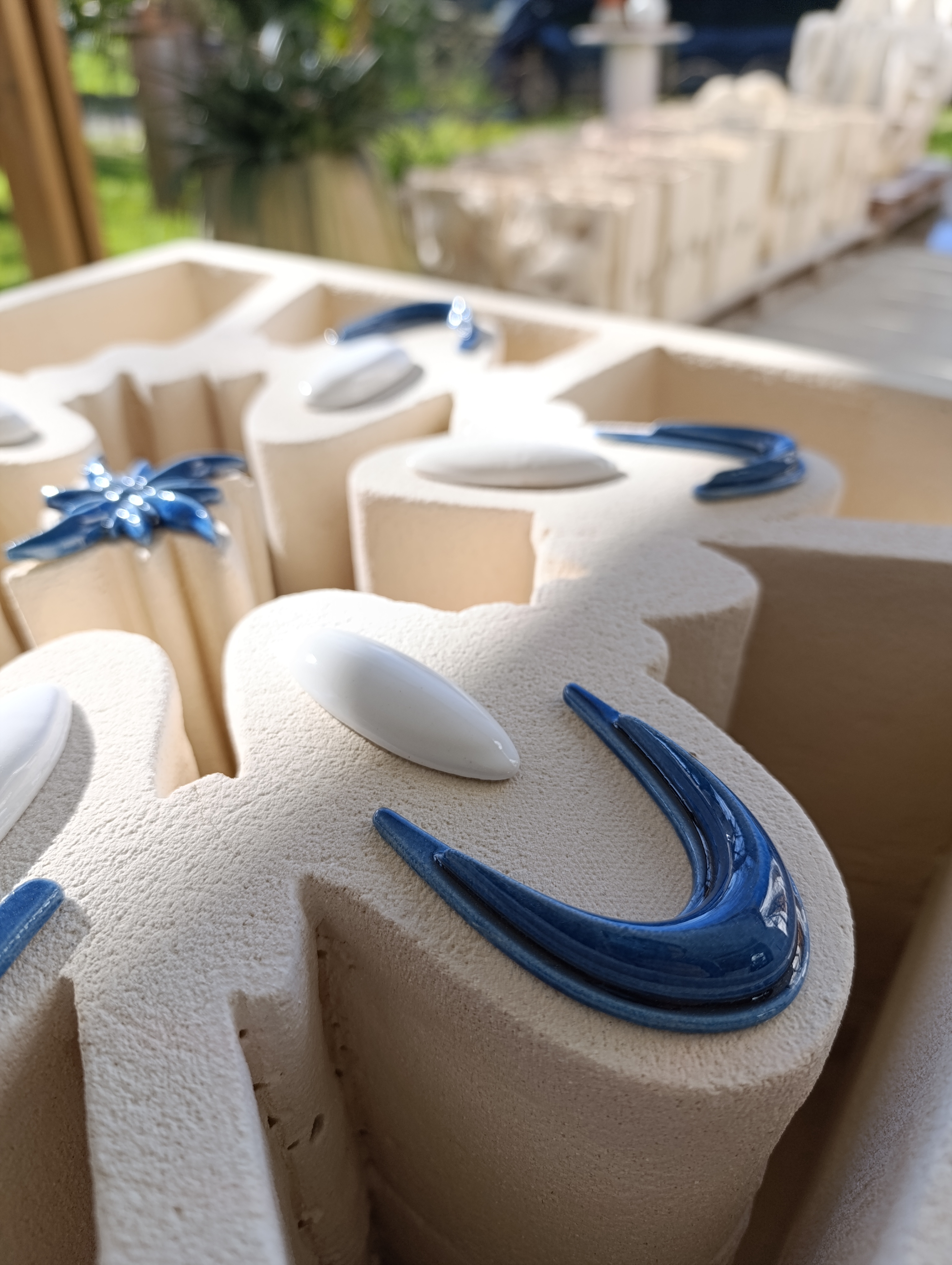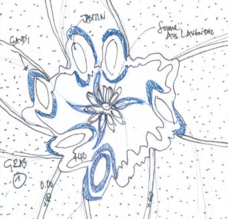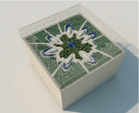 The central part, composed with a star, symbolizes the planet and the sun (in Barcelona blue). The raised oval shapes are (white) contemplative light fixtures with engraved (blue) stars that symbolize the movement of the moon around the imagined planet. The shapes around the light fixtures (towards the outside) are benches/armchairs covered with blue ceramic, referencing Gaudí’s art in Barcelona and allowing for peaceful contemplation of the garden. The star is a modulation of blue colour, surrounded by thyme plants (Thymus serpyllum “Coccineus”). Planting in the areas along the outer lines of the square is composed of scab plant (Raoulia australis).